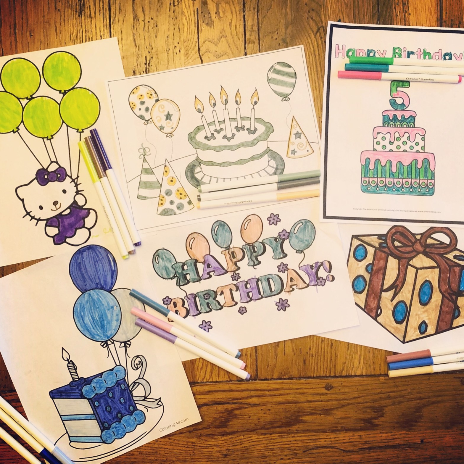 You pick a picture to color (we often like to do it around a “theme”—for this we did “Birthday”! You then have someone hold the marker container behind their back, and blindly draw out three markers for each person. Those are the colors you’ll use for your picture—no trading or adding (although we keep the black marker out of the mix)!
