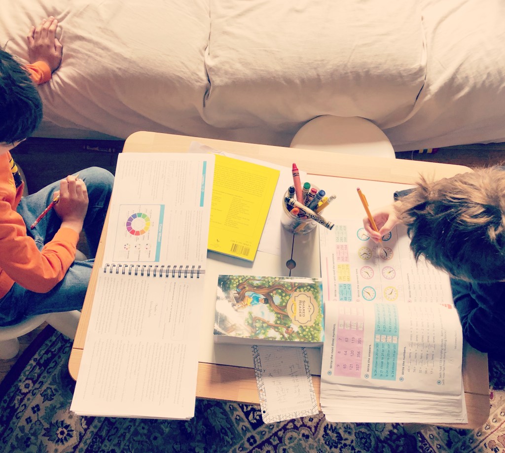 And YET…the other morning, after being up most of the night with a teething baby, I came downstairs just in time to snap this pic. It was pretty early in the morning still, but these two had gotten dressed, brushed their teeth, and were busy working on their schoolwork for the day while Mama slept.
