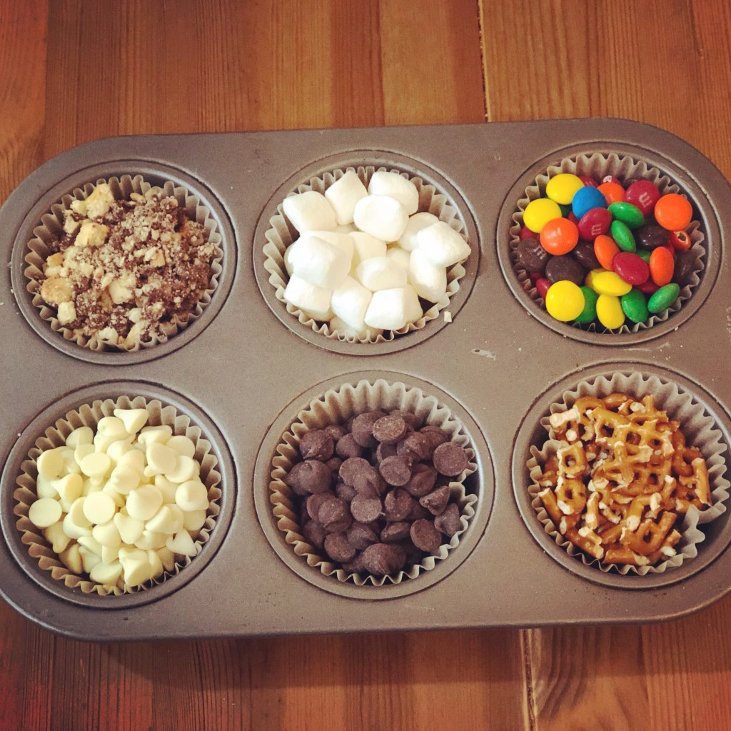 Want an easy win, Mama? Invite your kid(s) to a homemade sundae bar. Fill a muffin tin with whatever leftover odds and ends you have on hand. (I used crushed cookies, mini marshmallows, M & Ms, white chocolate chips, dark chocolate chips and broken pretzels). Scoop some ice cream into mason jars or drinking glasses, and let them add their favorite toppings.